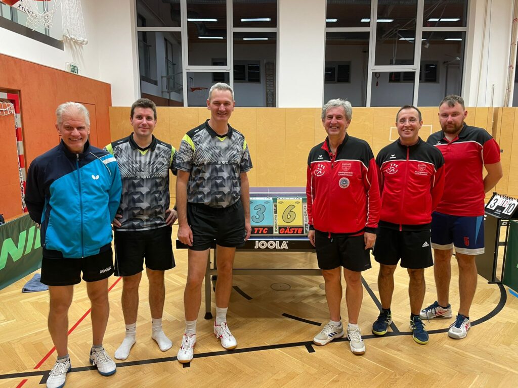 Wir spielten auf 2 Tischen! Stefan verlor gegen Thomas den ersten Satz. Danach ließ er seinem Gegner keine Chance und brachte uns in Führung! Norbert kam gegen Jan gut ins Spiel – 6 Tröpfler im 1. Satz gegen ihn waren aber zu viel. Nach gewonnen 2. Satz revanchierte sich Norbert und setzte den Satzball zum 13:11 an die Kante! Jan konnte jetzt zulegen, drehte das Spiel und gewann in 5 Sätzen.